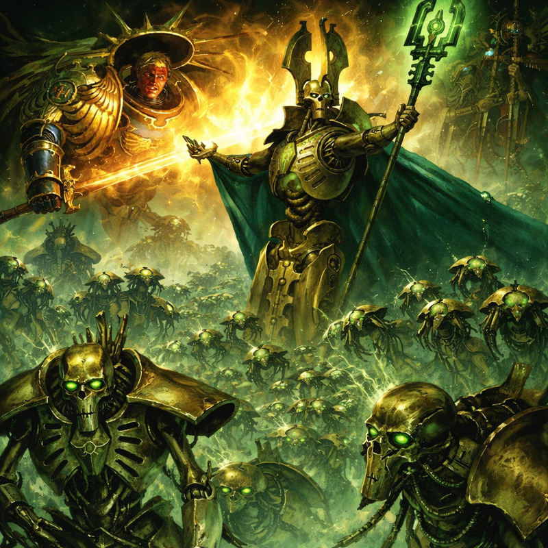 Fuera, la situación empeora: los constructos se vuelcan hacia el punto de aterrizaje y amenazan con devorar los thunderhawks. Messinius entiende que, si piden extracción, matarán a los transportes; ordena que despeguen con quien pueda subir, y uno de ellos es destruido en ascenso por una marea de máquinas. Con la ruta de escape comprometida, decide sostener la entrada para distraer al enemigo y ganar minutos para que Cawl termine su trabajo, aun sabiendo que eso puede costarles la vida. En paralelo, en el frente de Paradyce la trampa se cierra: los necrones aparecen en masa en órbita y dentro de la atmósfera, obligan a VanLeskus a abandonar transportes de tropas para salvar a la flota, y empiezan desembarcos mediante portales y naves monolíticas que se reparan bajo fuego. Guilliman ejecuta Exterminatus en Mesmoch para derribar un pilón, el embotamiento disminuye en ese sector y el enemigo “muerde el anzuelo” apareciendo con fuerza; la guerra escala a una fase abierta de flota contra flota. En tierra, Shanni y los pocos fanáticos que quedan sostienen trincheras hasta que llegan destructores y la línea se rompe, y en el vacío Athagey por fin entra en acción y decide acudir a ayudar a VanLeskus. Al final, Messinius acepta el diagnóstico de Hiax: quedarse fuera significa morir, así que opta por una apuesta más desesperada, avanzar “más adentro” por conexiones entre pirámides para reunirse con Cawl y consolidar una posición, porque la misión depende de que el archimagos tenga el tiempo que necesita.